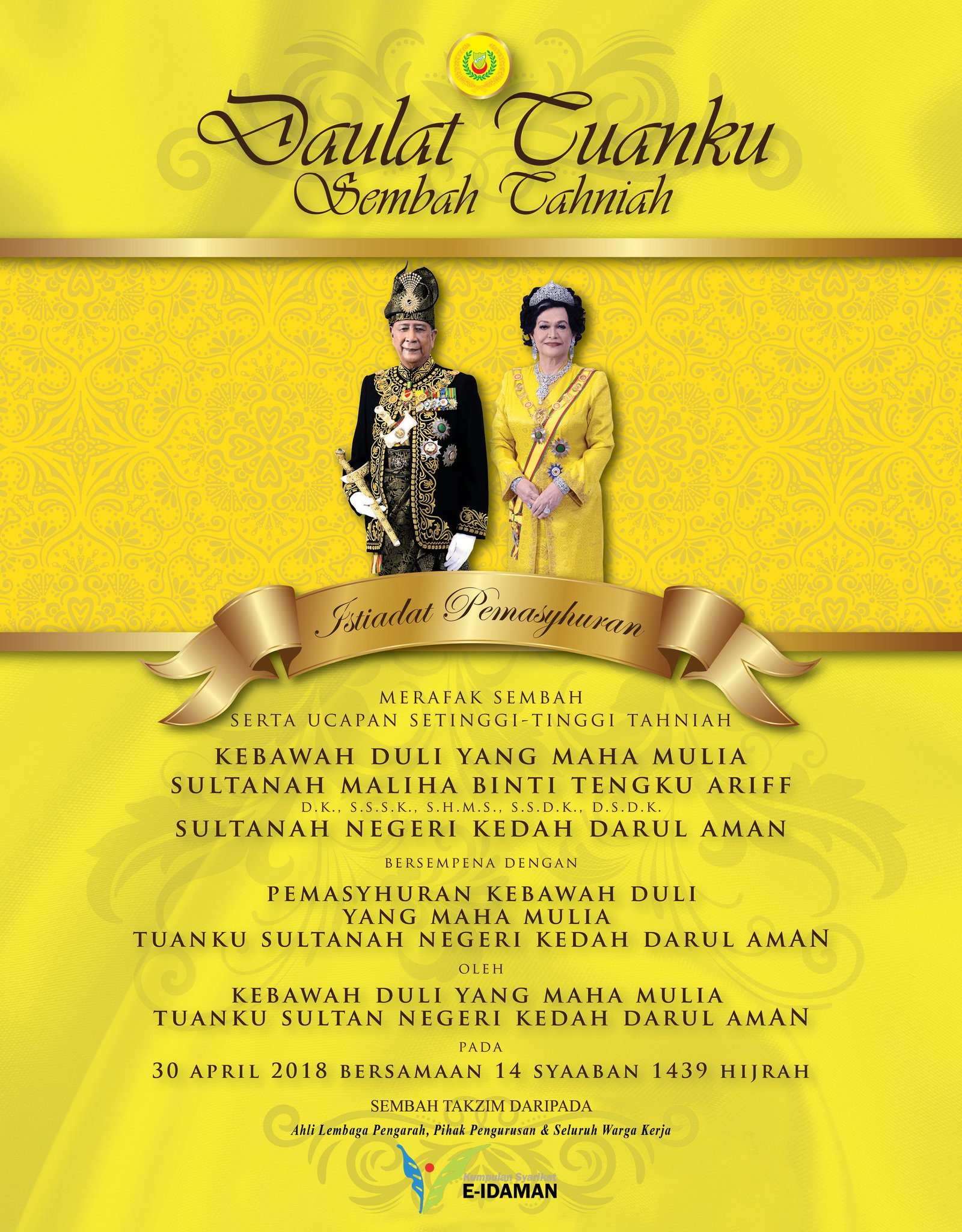 E Idaman Sdn Bhd در توییتر Daulat Tuanku Merafak Sembah Serta Ucapan Setinggi Tinggi Tahniah Kdymm Sultanah Maliha Binti Tengku Arif Sultanah Negeri Kedah Darul Aman Bersempena Dengan Pemasyuran Kdymm Tuanku Sultanah Kedah Darul